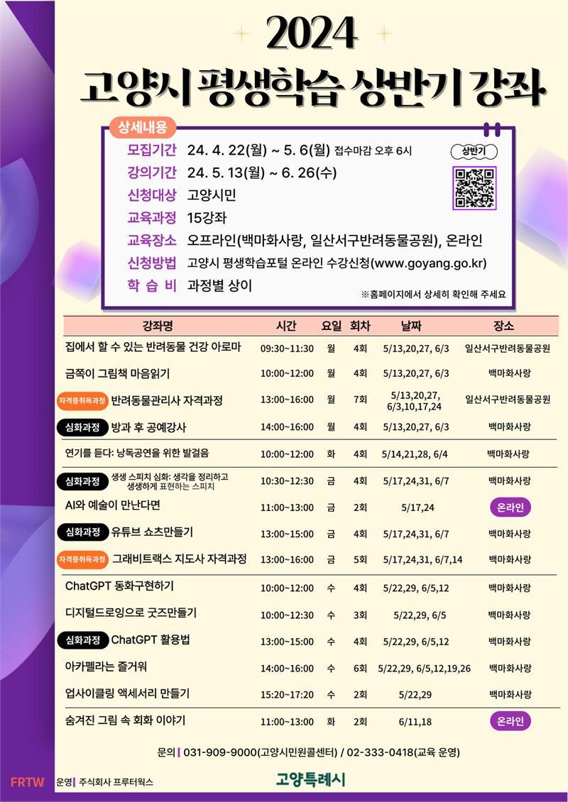 수강신청은 4월 22일 오전 9시부터 5월 6일 오후 6시까지 가능하며, 고양시 평생학습포털(https://www.goyang.go.kr/edu/)에서 온라인 접수로 진행된다. 평생학습은 유료로 진행되며, 학습비는 강좌 별로 상이하다. 기타 문의는 고양시민원콜센터(031-909-9000) 또는 평생교육과(031-8075-2294)로 하면 된다.