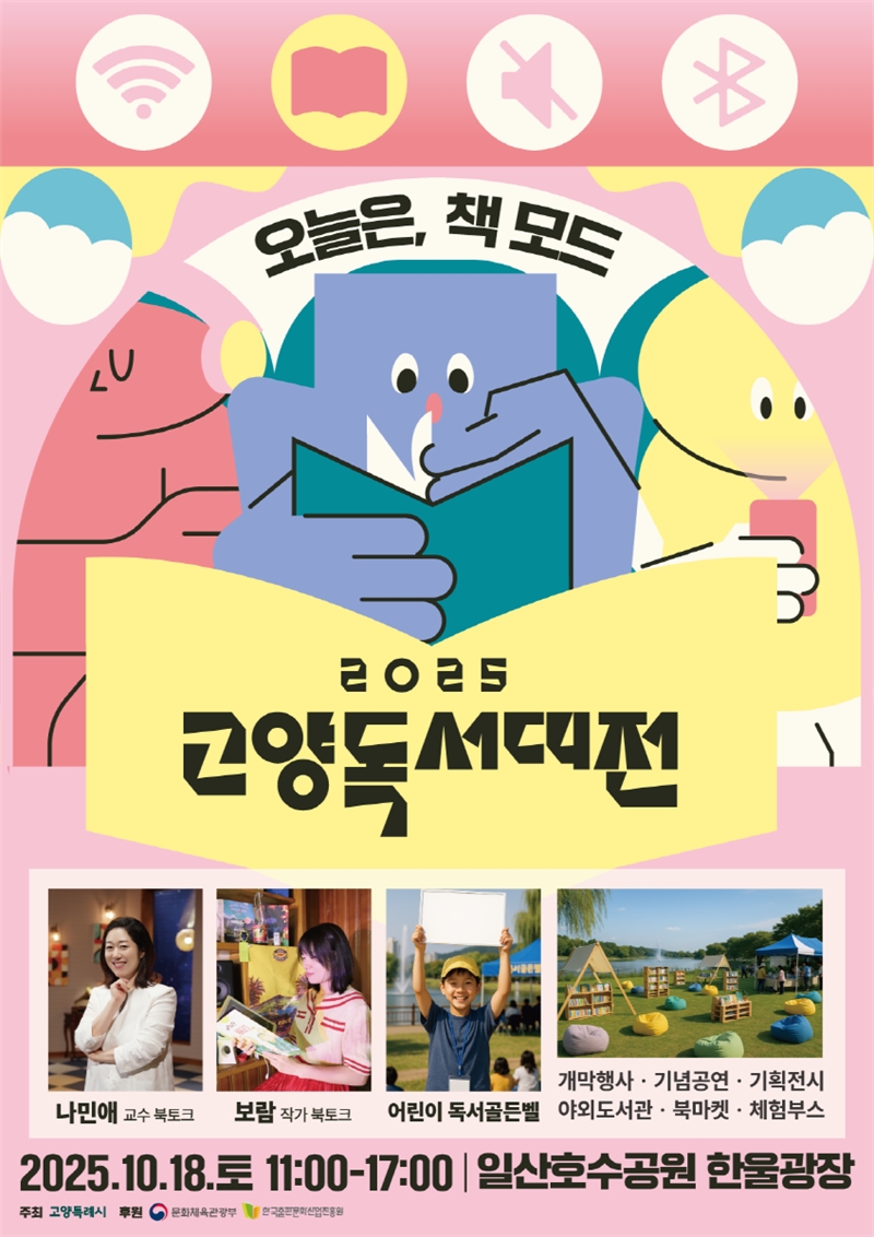 18일 일산호수공원 한울광장에서는 고양시 대표 독서문화축제 ‘2025 고양독서대전’이 열린다. ‘오늘은, 책 모드’를 슬로건으로 총 7개 영역, 31개 프로그램이 마련돼 책과 문화를 한자리에서 즐길 수 있다.