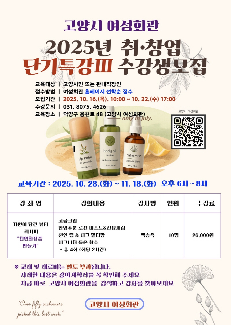 고양특례시 여성회관에서는 친환경과 건강을 중시하는 최신 트렌드를 반영한 ‘취창업 단기특강Ⅲ’ 수강생을 모집한다.