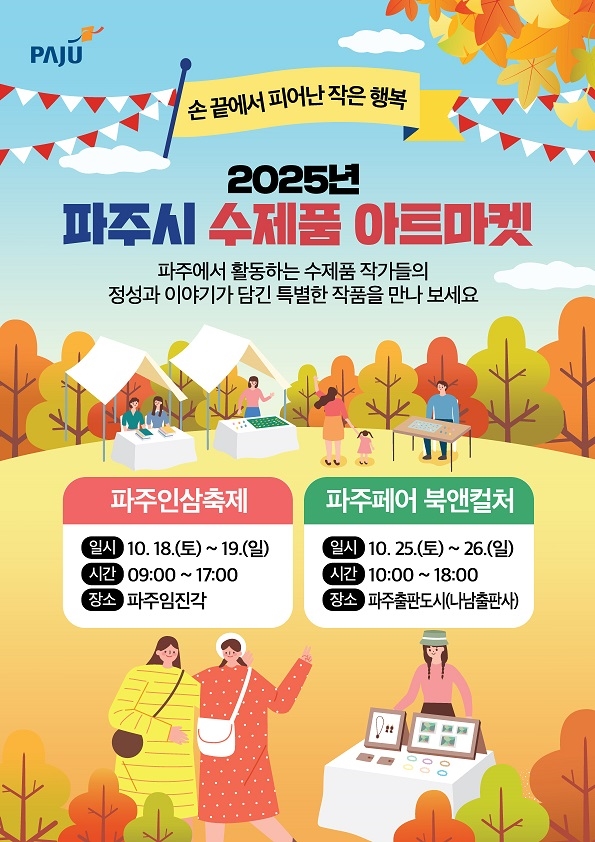 파주시는 오는 18일부터 19일까지 이틀간 열리는 ‘파주인삼축제’와 오는 25일부터 26일까지 개최되는 ‘파주페어_북앤컬처’ 행사장에서 지역 수공예 작가들이 참여하는 ‘수제품 아트마켓’을 운영한다.