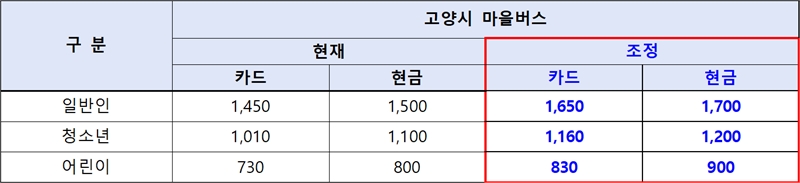 고양시는 마을버스 요금을 25일부터 일반인 카드요금 기준으로 200원 인상한다.