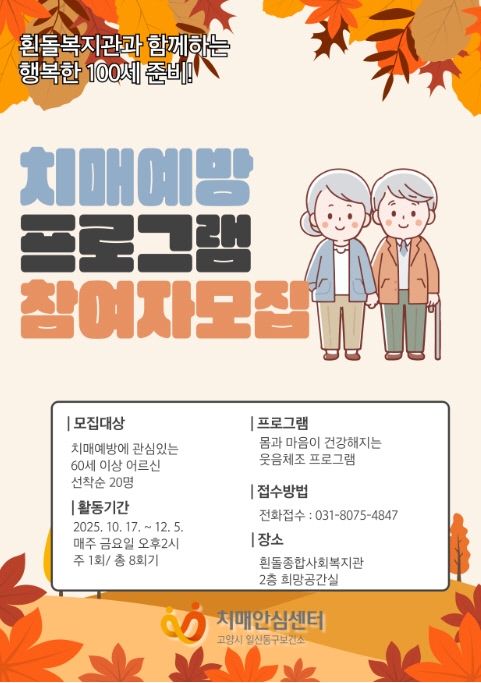 고양특례시 일산동구보건소 치매안심센터는 치매안심마을로 지정된 백석2동 흰돌복지관에서 운영되는 치매예방교실 ‘기억안심, 웃음활짝’의 참가자를 모집한다고 밝혔다.