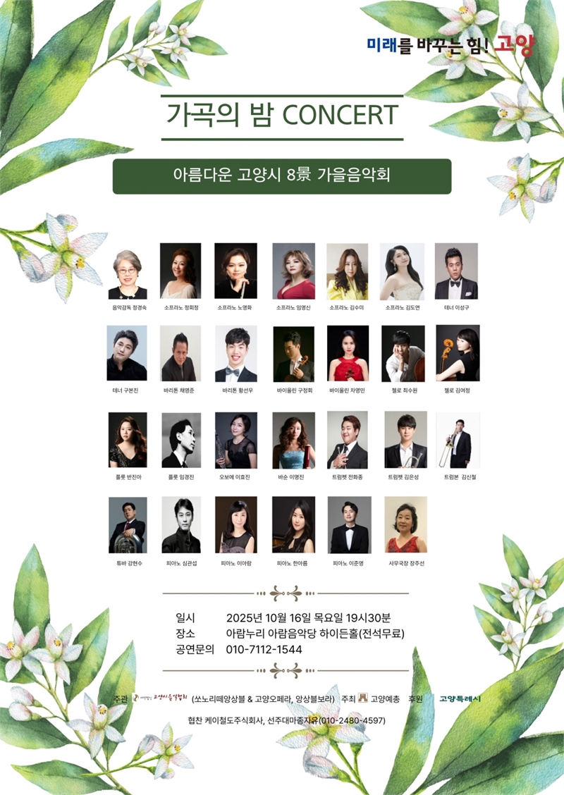 고양특례시가 후원하고 (사)한국예술문화단체총연합회 고양지회가 주최하며 (사)한국음악협회 고양지부가 주관하는 ‘2025 가곡의 밤 – 아름다운 고양시 8경(景) 가을 음악회’가 오는 16일 오후 7시 30분, 고양아람누리 아람음악당에서 개최된다.