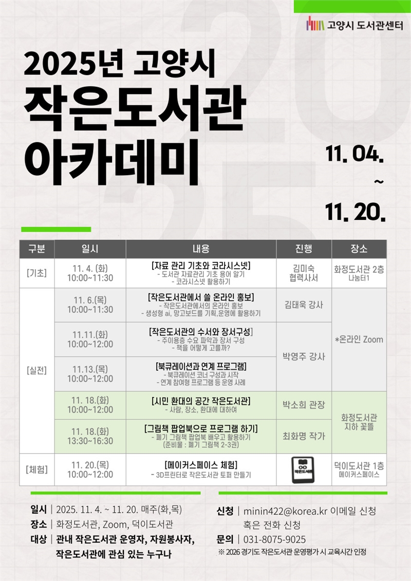 ‘2025년 작은도서관 아카데미’에 대한 자세한 사항은 고양시도서관센터 독서진흥팀(☎031-8075-9025)으로 문의하면 된다.