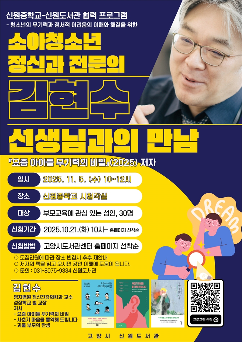 김현수 전문의는『요즘 아이들 무기력의 비밀』『사춘기 마음을 통역해 드립니다』등을 내고 ‘성장학교 별’의 교장으로서 청소년 이해와 올바른 자녀교육을 위해 노력해왔으며, 그의 강연과 질의응답 프로그램은 11월 5일 수요일, 10시부터 신원중학교에서 진행한다.