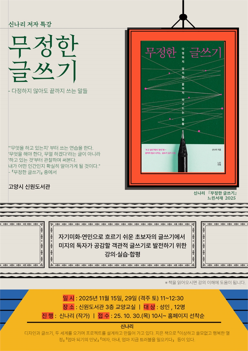 마지막으로 최근『무정한 글쓰기』를 출간한 신나리 작가의 글쓰기 수업이 11월 15일, 29일 토요일 11시부터 신원도서관에서 열린다. 좋아서 읽다 보니 자신의 글을 쓰고 싶어진 많은 독자들을 위한 글쓰기 수업이다. 자기미화·연민으로 흐르기 쉬운 초보자의 글쓰기에서 미지의 독자가 공감할 객관적 글쓰기로 발전하기 위한 강의와 실습·합평으로 구성된다. 짧은 수업이지만 한 걸음 전진을 돕는 징검다리가 될 것으로 보인다.