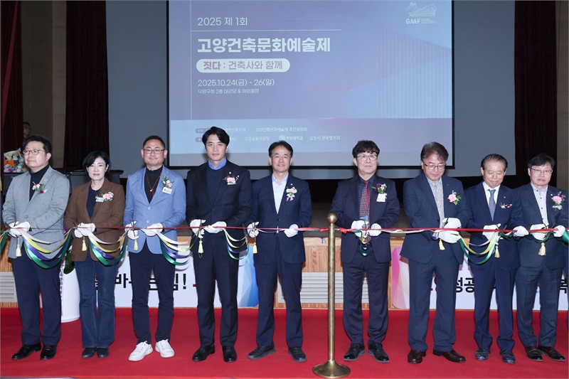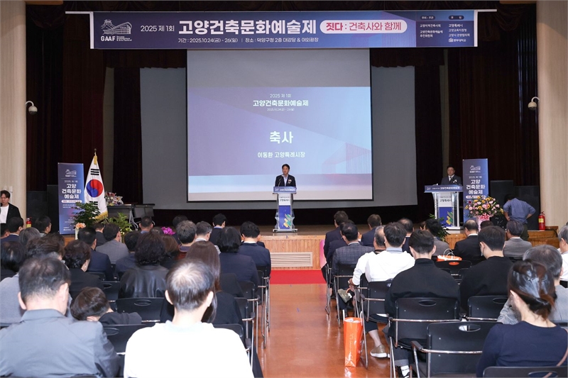 이동환 고양시장이 지난 25일 덕양구청 2층 대강당에서 열린' 제1회 고양건축문화예술제' 개막식에 참석해 축사를 했다. 26일까지 진행되는 이번 행사에서는 고양시 건축사 초대전, 사진작품전, 대학교 졸업작품전 등을 감상할 수 있다.