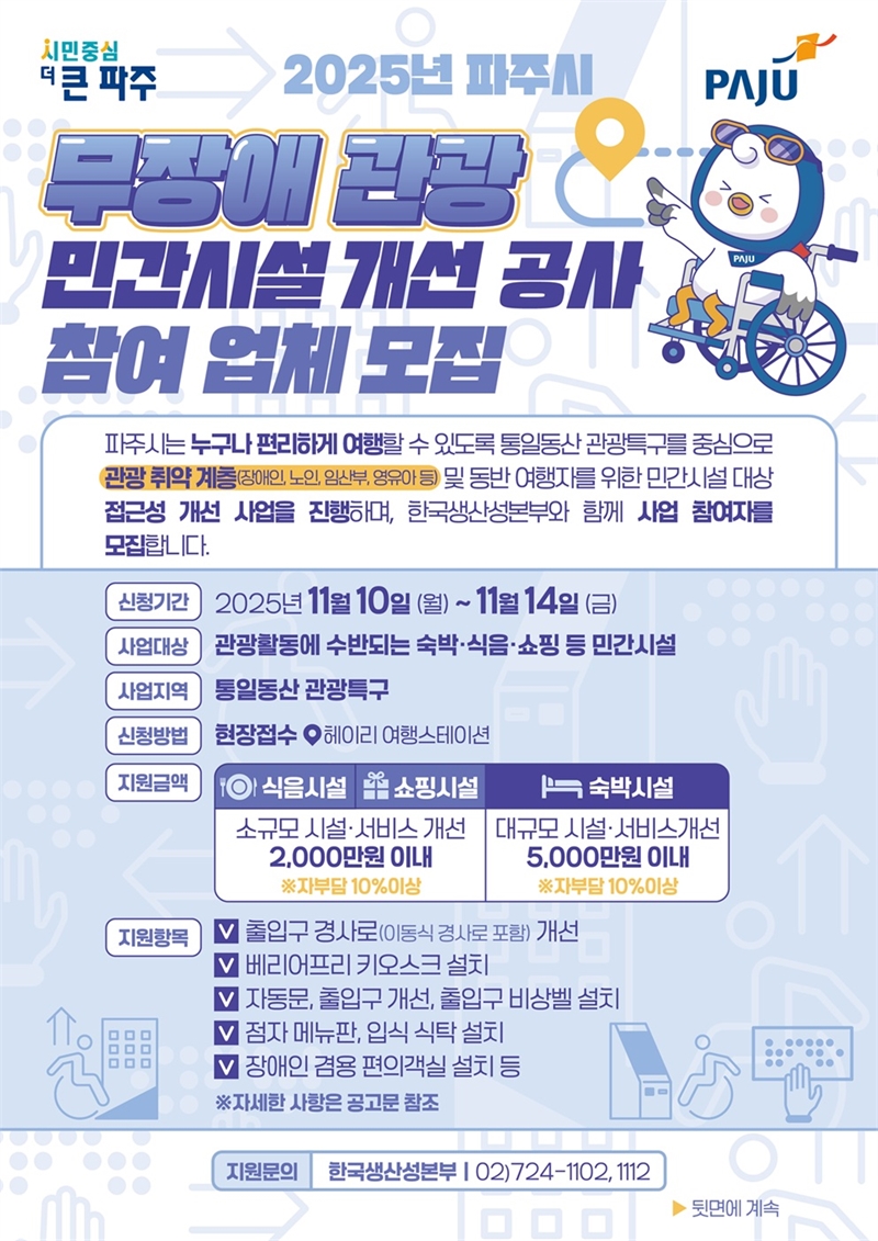 파주시는 관광 취약계층을 포함한 모든 시민이 편리하게 여행할 수 있는 관광환경을 조성하기 위해 ‘2025년 무장애 관광 민간시설 개선공사 지원사업’에 참여할 업소를 모집한다고 밝혔다.