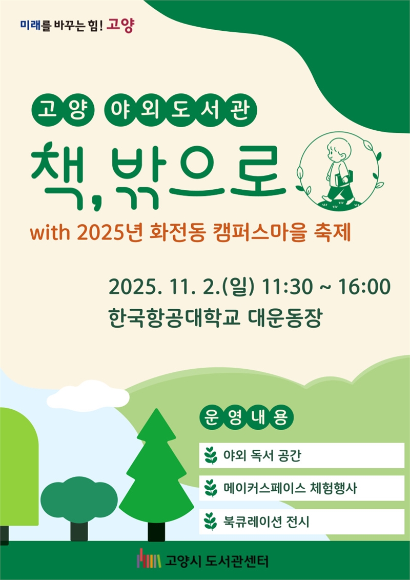 고양시 도서관센터는 오는 11월 2일 오전 11시 30분부터 오후 4시까지 한국항공대학교 대운동장에서 열리는 ‘화전동 캠퍼스 마을축제’현장에서 고양 야외도서관 ‘책, 밖으로’를 운영한다.