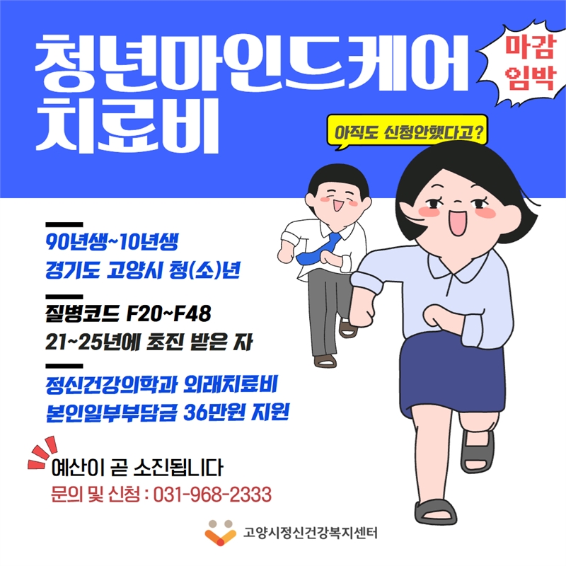 고양시는 정신건강 취약계층 청(소)년을 대상으로 정신건강의학과 외래 진료비를 지원하는 ‘청년마인드케어’ 사업을 운영하고 있다.