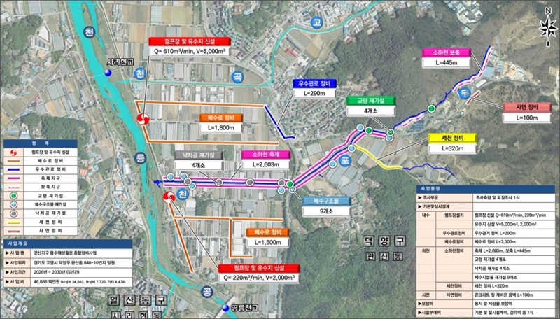 강매지구는 2028년 준공을 목표로 강매 제2배수펌프장 신설 사업을 진행한다. 배수펌프 8대와 유수지 확장을 통해 배수 용량 6,700㎥/분, 유수지 용량 8만 3,400㎥ 규모로 50년 빈도 기준 4시간, 194㎜의 폭우를 견딜 수 있게 설계됐다.