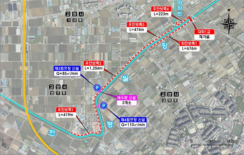 창릉천 배수영향구간에는 494억 원(국비)을 투입해 하천연장 3.15㎞ 구간의 제방 축제 및 보축 등 하천 정비사업을 실시한다. 또, 매년 유채꽃·코스모스 축제가 열리는 창릉천 강매석교공원 일원에 10억 원(도비)을 들여 산책로와 도로, 저수로, 안내판 등 기존 노후 시설물을 정비한다.