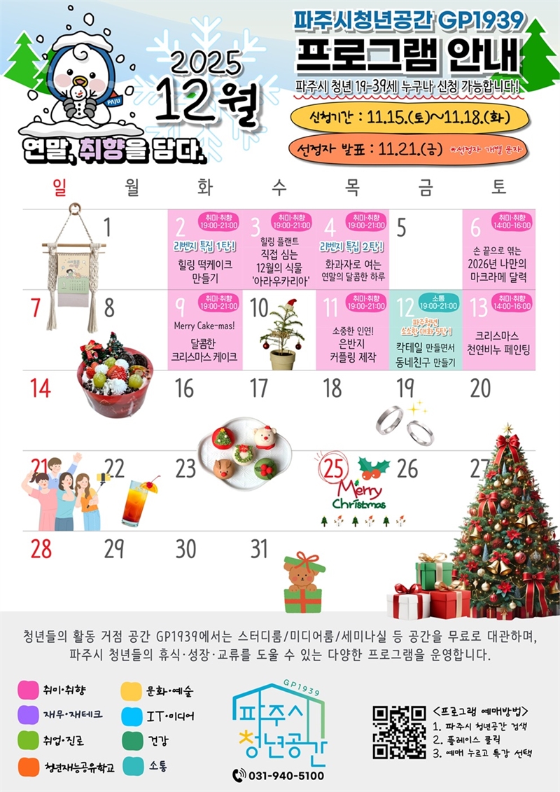 파주시 청년공간 지피(GP)1939가 한 해의 끝자락에서 청년들의 일상에 특별한 감성을 더할 12월 프로그램을 운영한다고 밝혔다.