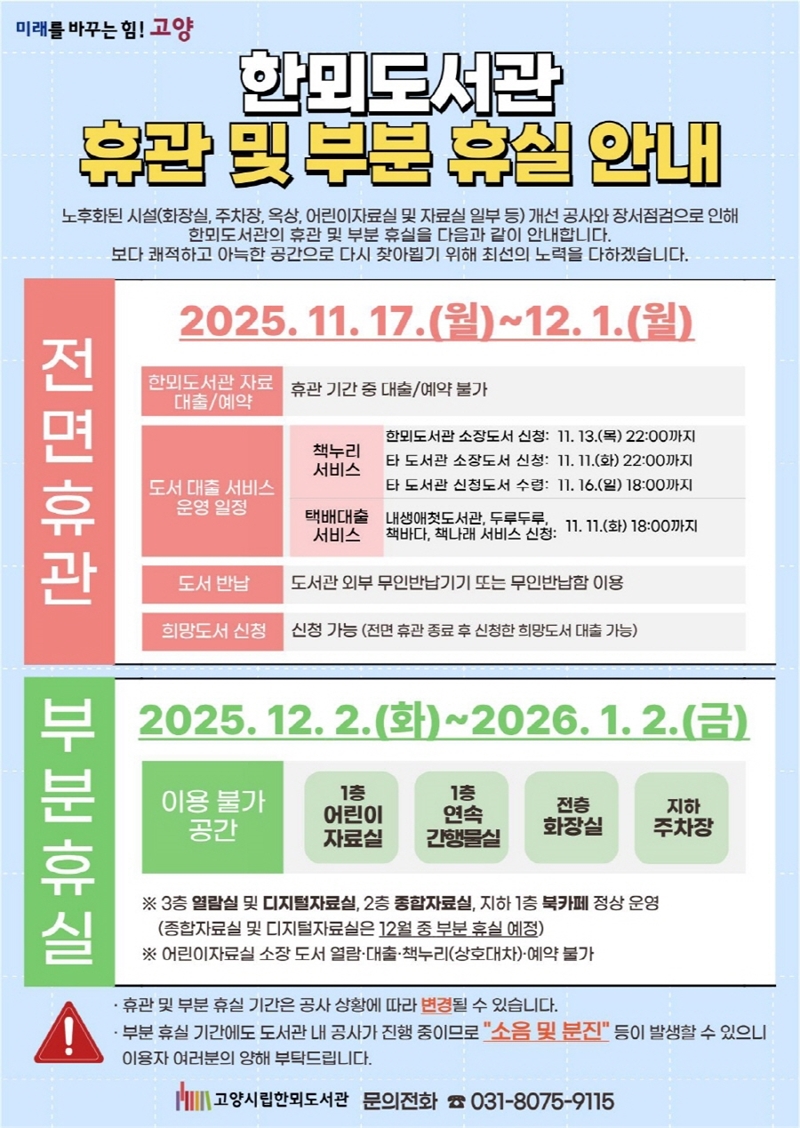 고양특례시 한뫼도서관은 공간 및 환경개선 공사 등을 위해 오는 11월 17일부터 12월 1일까지 15일간 임시 휴관한다고 밝혔다. 전체 공사는 부분 휴실을 포함해 내년 2월 준공을 목표로 진행될 예정이다.