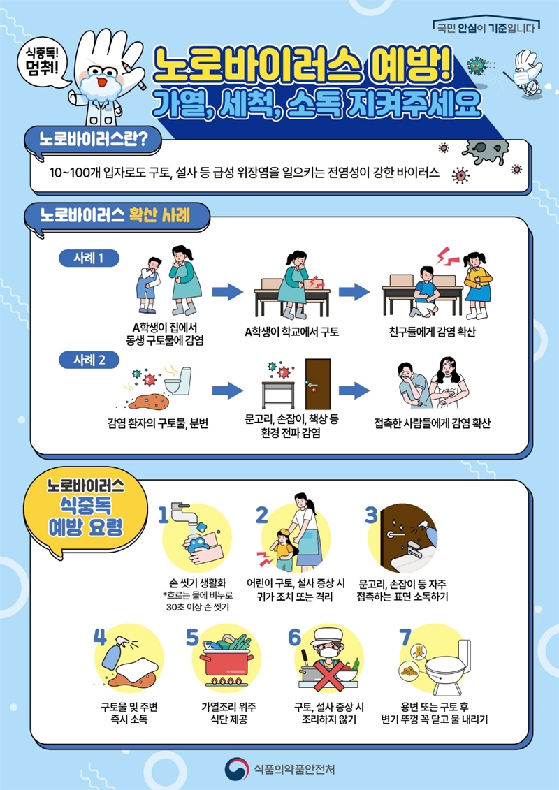 노로바이러스는 낮은 온도에서도 오래 생존하고 소량만으로도 감염을 일으키는 특성이 있어 11월부터 이듬해 4월까지 집중적으로 발생한다. 잠복기는 12~48시간이며 구토, 설사, 복통, 발열 등의 증상이 나타나며 특히 영유아와 노약자는 증상이 심해질 수 있어 더욱 주의가 필요하다.