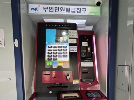 현재 파주시에는 총 45대(40개소)의 무인민원발급기가 설치되어 있으며 18개 업무 123종의 민원서류 발급이 가능하다. 무인민원발급기 위치와 운영시간은 파주시청 또는 정부24 누리집에서 확인할 수 있다.