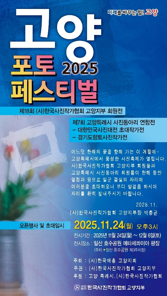고양특례시가 후원하고 (사)한국사진작가협회 고양지부가 주관하는 ‘2025 고양 포토페스티벌’이 11월 24일부터 12월 6일까지 일산호수공원 메타세쿼이아광장에서 개최된다.