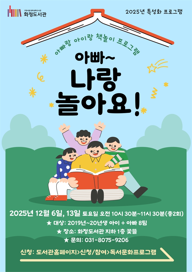 화정도서관은 오는 12월 6일, 13일 토요일 오전 10시 30분, 화정도서관 지하 1층 꽃뜰에서 특성화 프로그램 ‘아빠~ 나랑 놀아요!'를 운영한다.