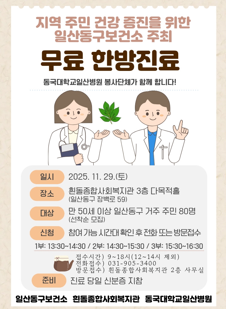 무료 한방진료와 관련된 자세한 문의는 일산동구보건소 건강증진과 방문보건팀(☎031-8075-4121)으로 하면 된다.