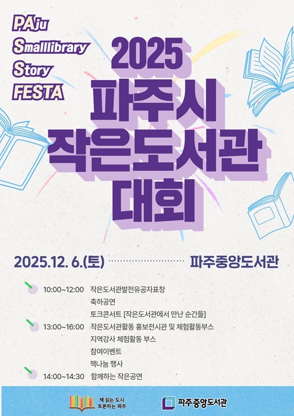파주시 중앙도서관은 12월 6일 한 해 동안 작은도서관의 다양한 활동을 시민들과 함께 공유하고 운영자들을 격려하기 위한 ‘2025 파주시 작은도서관대회 패스 페스타(PASS FESTA)’를 개최한다고 밝혔다.