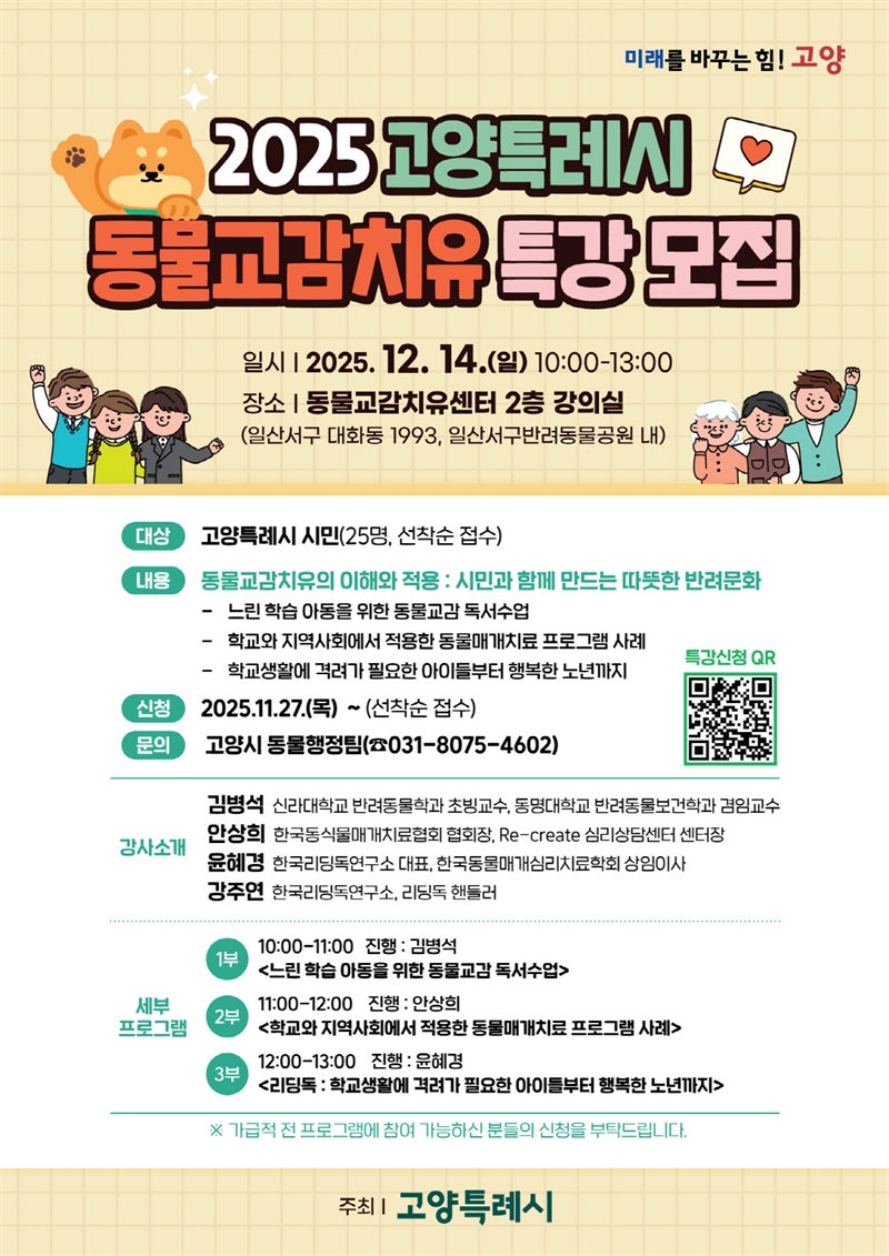 고양특례시는 반려동물과의 건강한 공존 문화를 조성하고 동물교감치유에 대한 시민 인식을 확산시키기 위해 ‘2025년 고양특례시 동물교감치유 특강’수강생을 모집한다고 밝혔다.