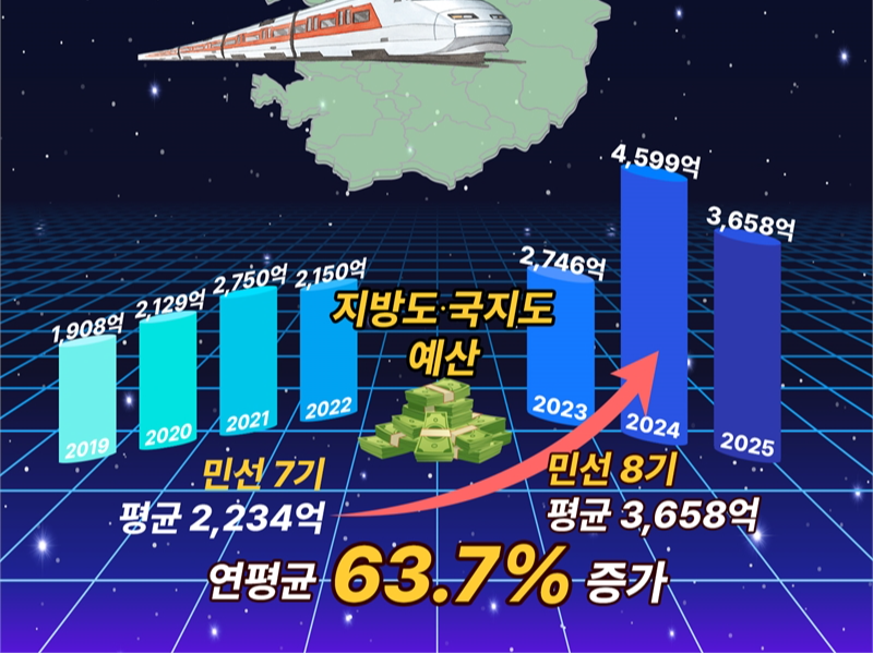 민선 7기 관련 예산이 2019년 1,908억, 2020년 2,129억, 2021년 2,750억, 2022년 2,150억 등 평균 2,234억 원이었는데 민선 8기에는 2023년 2,746억, 2024년 4,599억, 2025년 3,629억 등 평균 3,658억 원으로 증가율 63.7%를 보였다.