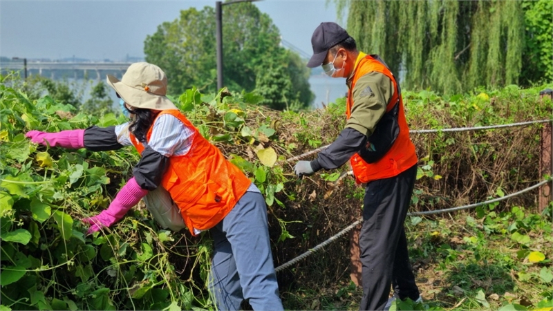 행주산성역사공원 수변길 일대에서 유해식물 제거 중인 에코 볼런투어 참여 봉사자