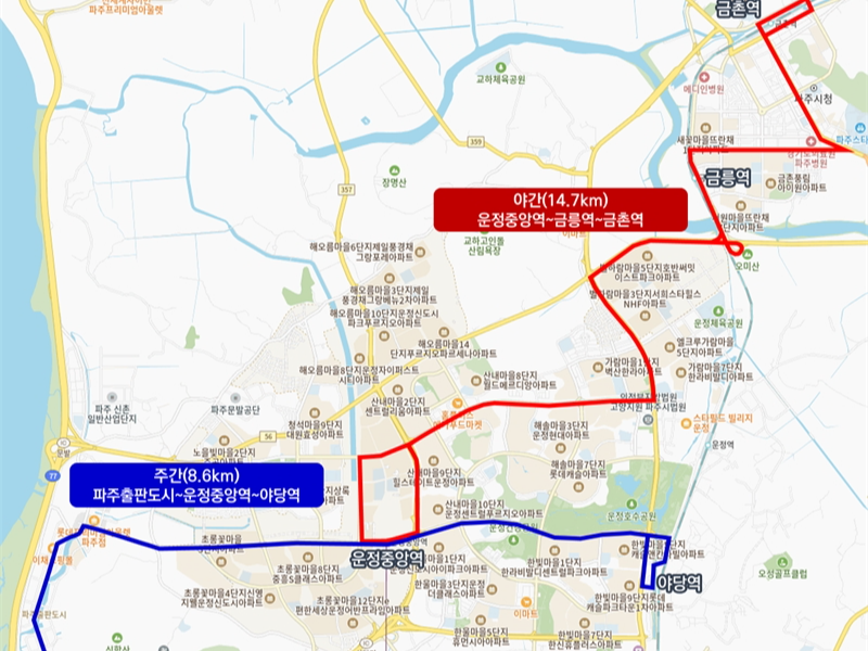 야간 노선은 운정중앙역–운정신도시–금촌역을 잇는 14.7km 구간으로 GTX-A 막차시간 이후까지 운행해 운정·금촌 생활권의 대중교통수단 확충과 심야 이동 편의 제공에 기여할 전망이다.