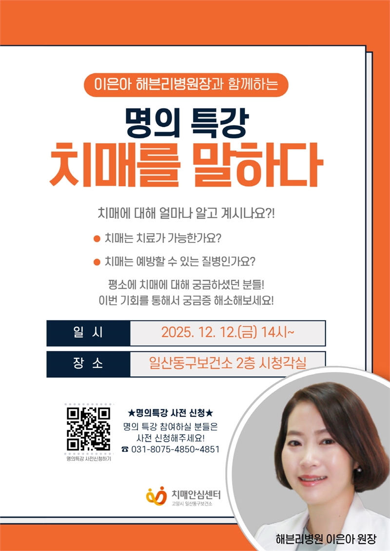 이번 명의 특강 ‘치매를 말하다’는 12일, 일산동구보건소 시청각실(2층)에서 14시부터 진행되며, 사전 접수를 통해 참가 신청을 받는다. 당일 현장접수로 참여도 가능하다. 자세한 일정과 신청방법은 일산동구보건소 치매안심센터 누리집(홈페이지)에서도 확인할 수 있다.