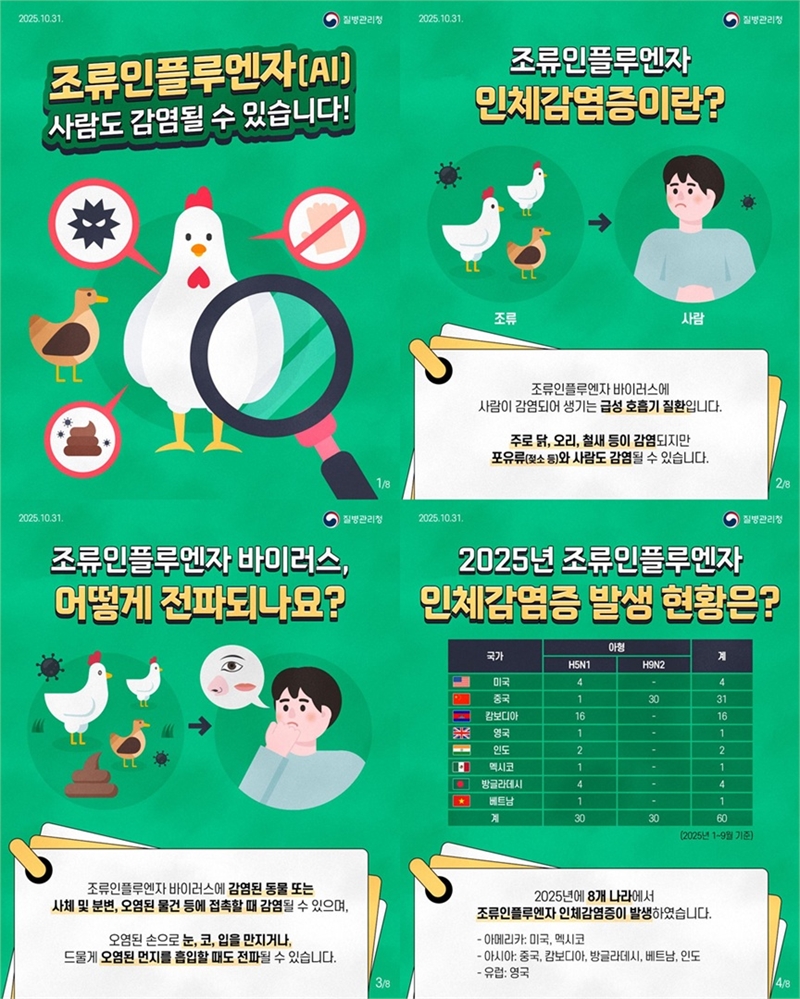 이한상 파주보건소장은 “조류인플루엔자 발생 농가에 방문하거나 야생조류 등의 사체와 접촉 후 10일 이내 발열, 근육통, 인후통 등 호흡기 증상 혹은 결막염 증상이 발생한다면, 즉시 보건소(☎031-940-9718) 또는 질병관리청(☎1339)으로 연락할 것을 부탁드린다”라며 “가금류 및 야생조류 접촉을 피하며 올바른 손 씻기와 마스크 착용 등 개인위생 수칙 준수에 힘써줄 것을 당부한다”라고 밝혔다.