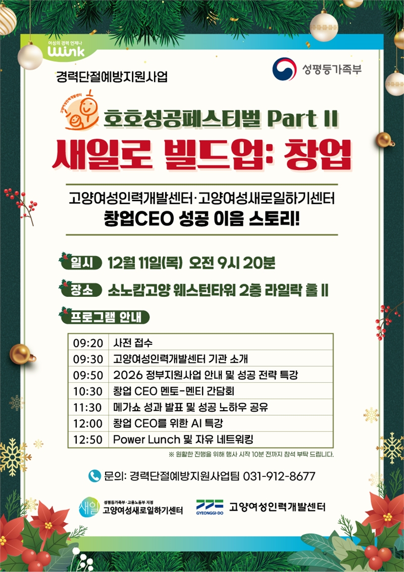 고양여성새로일하기센터는 11일 소노캄 고양에서 ‘호호 성공페스티벌 Part II – 새일로 빌드업 창업’을 개최한다.