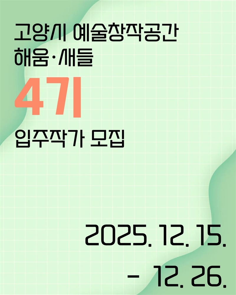 고양특례시는 지역 미술 생태계를 활성화하고 작가들의 안정적인 창작 활동을 지원하기 위해 오는 26일까지 ‘고양시 예술창작공간 해움·새들’ 제4기 입주작가를 공개 모집한다고 밝혔다.